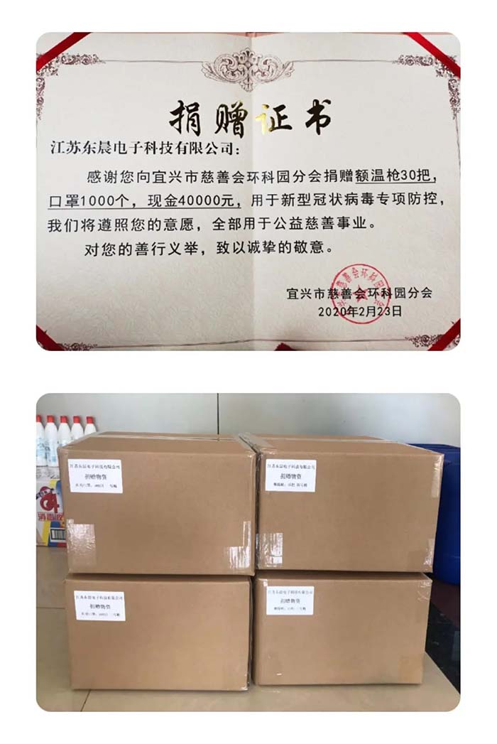 连日来,江苏东晨在一手抓复产复工,一手抓疫情防控防护工作的同时,向宜兴市慈善会环科园分会捐赠了5万5千元的防疫物资和善款,用于新型冠状病毒专项防控,竭尽所能为疫情防控工作提供援助,为打赢这场战役贡献力量。