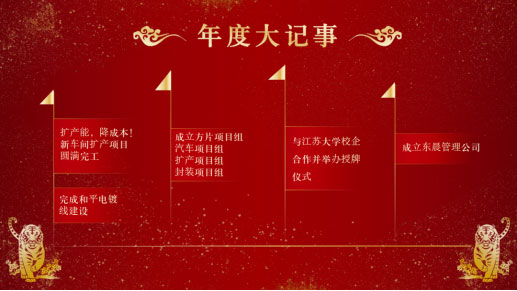 晚宴开始,由公司董事长兼总经理沈一舟先生做祝酒辞,感谢了全体员工2021年的辛勤付出,公司的发展离不开大家的信赖与支持。在东晨业绩一路增长的喜讯里,沈总对东晨的壮大寄予深深的希望和祝福,希望大家都继续保持激情和干劲,为东晨的2022而奋斗。回顾去年,我们追求卓越,启航2022,让我们凝心聚力,拓路前行!